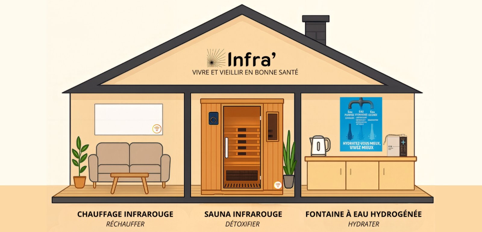 Tous les trois, père, fils et petit-fils, passionnés par le bien-être, le sport et la santé, utilisateurs convaincus depuis plus de 20 ans, se lancent en 2019 dans une aventure commune portée par le désir de transmettre et créent Infra’s, une société d’importation et de distribution de saunas japonais infrarouge de conception suisse, offrant des bienfaits uniques pour le corps et l’esprit. Utilisables à tout âge, de 3 à 99 ans et sans contre-indication, ces saunas sont simples d’utilisation, sans entretien et à moindre coût : une séance intensive pour le prix d’une demi-baguette de pain ! Déstressants, détoxifiants et stimulants, les Infra’s proposent une thérapie douce pour mieux vivre au quotidien. Ils améliorent la circulation sanguine et la santé cardiovasculaire, soulagent les douleurs musculaires et articulaires, favorisent la relaxation, la perte de poids et la qualité de la peau. Cette technologie performante et peu énergivore stimule directement les cellules par les rayons infrarouges, sans augmentation de la température ambiante, et contribue à la vitalité et au bien-être de chacun selon ses besoins : 10 minutes par jour ou 45 minutes une ou plusieurs fois par semaine. Adoptez le slogan des fondateurs : « Vivre et vieillir en bonne santé ».